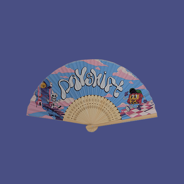 Bamboo framed paper fan with singled-sided Dayshift Episode 5 printed artwork.