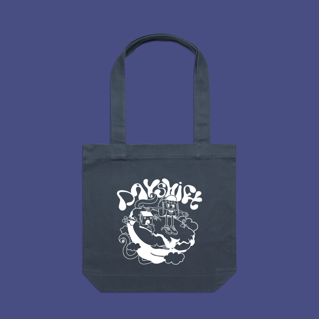 Locally printed blue tote bags. Dayshift episode 8 logo printed on AS Colour Carrie Bag stock.