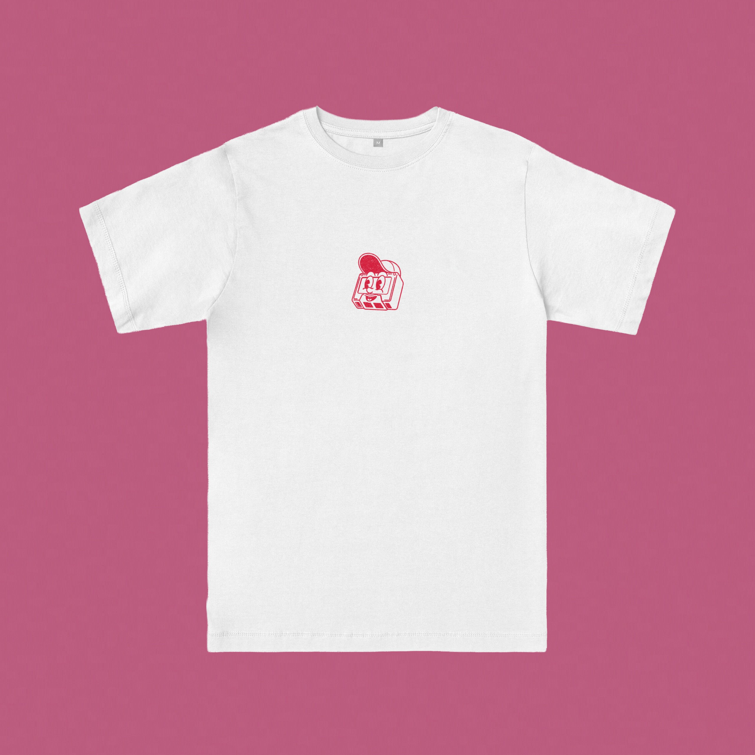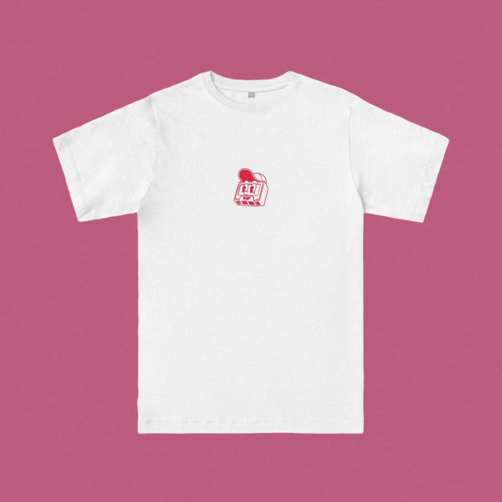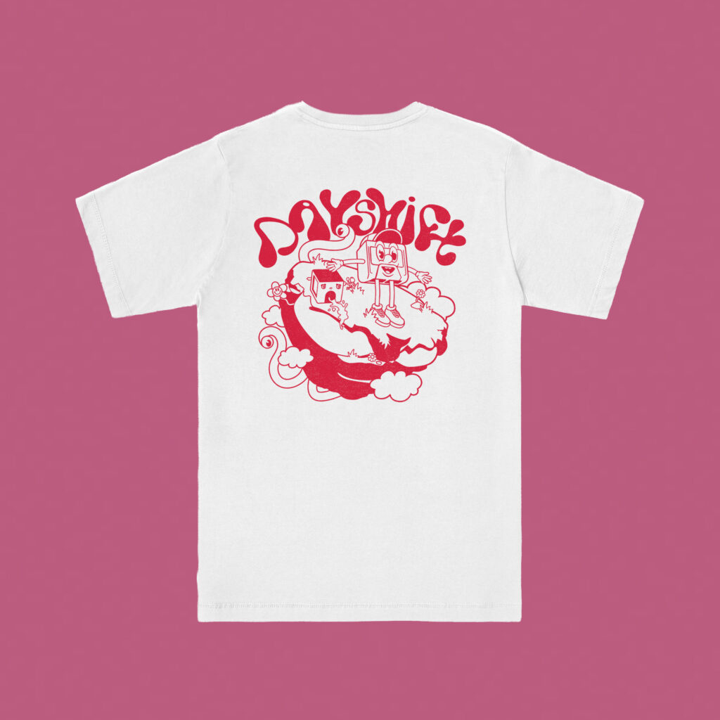 White locally screen printed Dayshift t-shirt. Shifty printed on the front with the Dayshift Episode 7 design printed on the back. Printed on AS Colour heavy weight t-shirt stock.